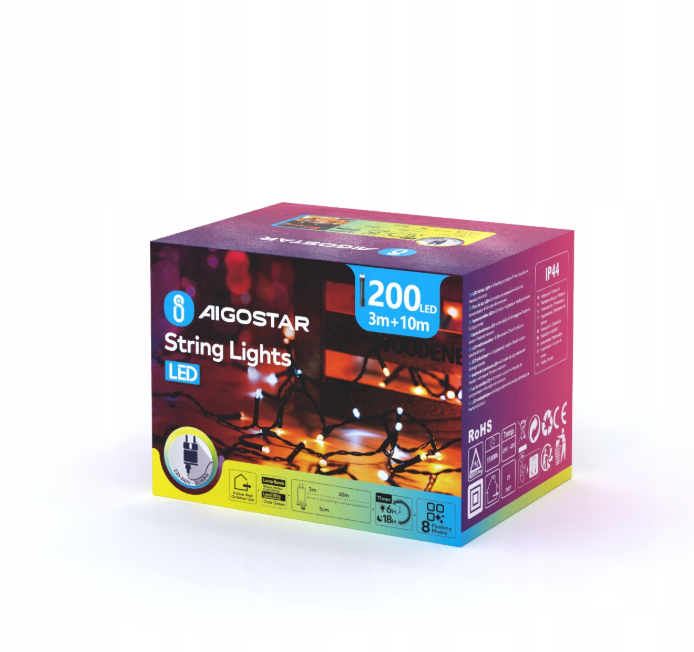 Klasyczny łańcuch świetlny z 200 diodami LED o długości 10 m - idealny do dekoracji choinki, balkonu, tarasu, okien czy ogrodu. Lampki oferują regulowaną barwę światła (od ciepłej 2700 K do chłodnej 6500 K), co pozwala dopasować klimat wnętrza lub dekoracji. Dzięki klasie szczelności IP44 nadają się do użytku wewnątrz i na zewnątrz, a energooszczędne diody LED zapewniają niskie zużycie prądu przy dużej jasności.