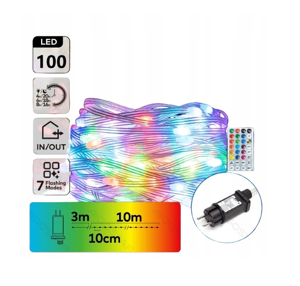 Lampki LED o długości 10 m z 100 diodami RGB - idealne do dekoracji pokoju, balkonu, tarasu czy choinki. RGB-IC oznacza płynną, dynamiczną zmianę kolorów, co daje efekt dekoracyjnego, „żywego” światła. Lampki są lekkie, elastyczne i można je używać zarówno wewnątrz, jak i na zewnątrz.