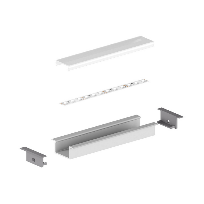 Profil P14-2 jest przeznaczony do wpuszczania w wyfrezowane lub wycięte otwory. Może zostać użyty w dowolnej powierzchni (GK, płyty meblowe, ściany, sufity, itp.),a estetyczne skrzydełka kompletnie zasłonią krawędzie otworu. Dzięki szerokości pozwalającej zmieścić do 2 taśm LED, może tworzyć niewielką oprawę o wysokim strumieniu świetlnym. Zwiększona wysokość profilu w porównaniu do P14-1 pozwala przy zastosowaniu gęstszej taśmy na uzyskanie linii światła na całej powierzchni osłonki (dot’s free). Stosowany między innymi w meblarstwie i przy wykańczaniu wnętrz. Minimalna głębokość otworu tylko 11,8mm.