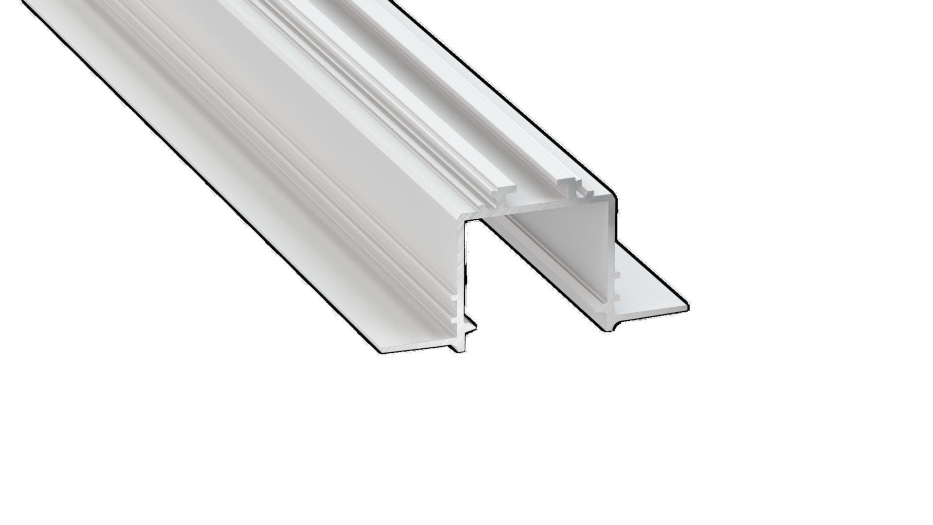Szeroki profil wpuszczany, dzięki którego mamy możliwość instalacji 2 pasków taśmy LED o szerokości 12mm. Tutaj profil z lakierowaną na biało powierzchnią.