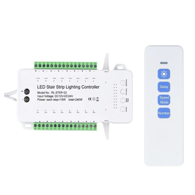 Sterownik wyposażony jest w 2 czujki PIR na przewodach które umieszczamy na dole schodów i na górze schodów. W momencie kiedy jedna z czujek wykryje ruch (wchodzimy lub zachodzimy) zapalanie oświetlenia odbywa się kolejno od pierwszego światła to ostatniego lub od ostatniego do pierwszego, w zależności która czujka wykryje ruch.