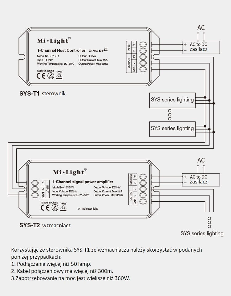 Wzmacniacz współpracuje tylko ze sterownikami SYS-T1 oraz z produktami serii SYS: