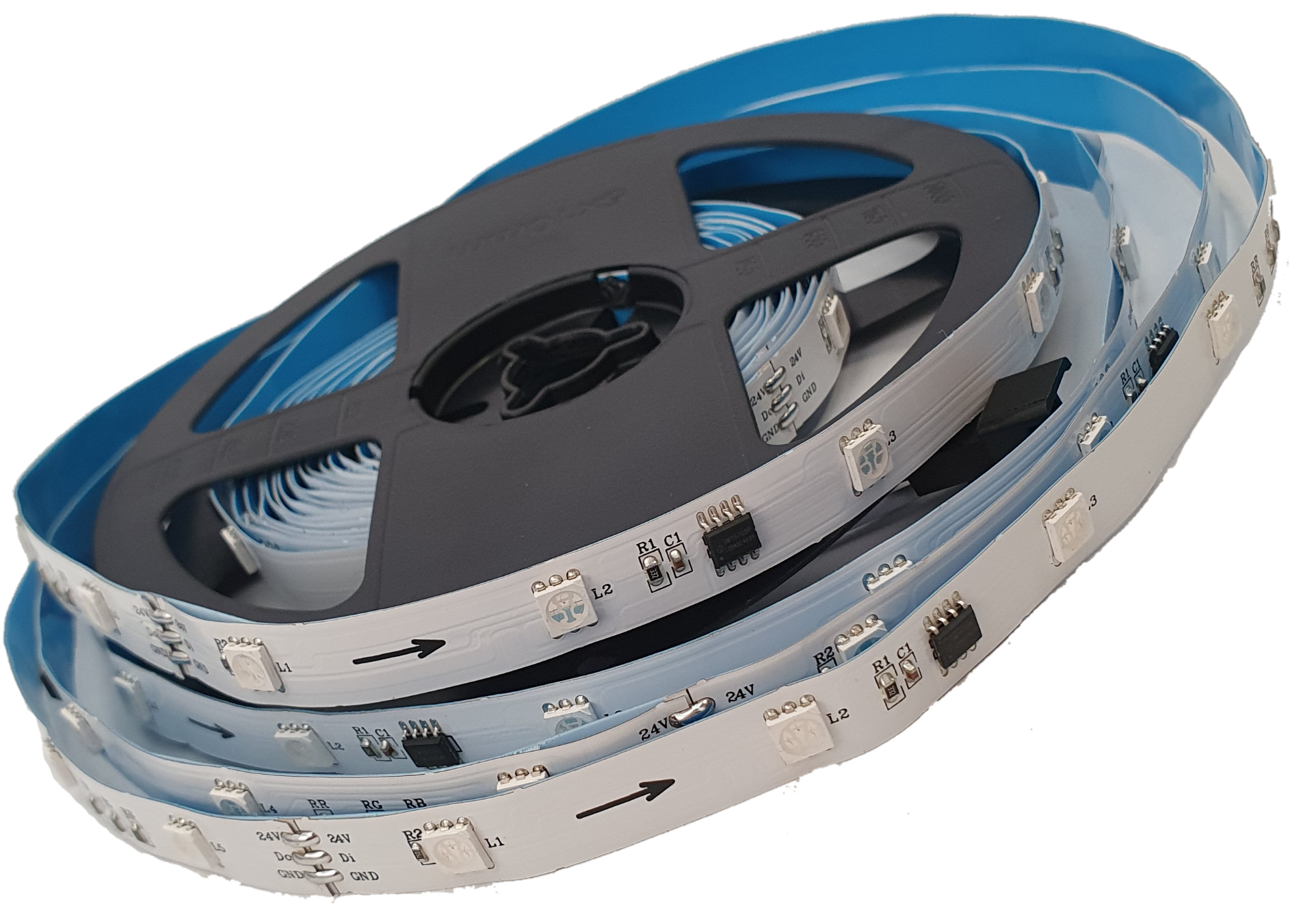 Taśma magic LED z chipami SM16703ic i diodami typu RGB SMD 5050 o szerokości 10 mm i długości 5 metrów. W porównaniu ze zwykłą, cyfrowa taśma RGB pozwala uzyskać więcej ciekawych efektów, jak na przykład poruszanie sie światła. Mikrochip steruje każdą diodą z osobna, niczym pojedynczym pikselem. Diody RGB umożliwiają emisję całej balety barw przy pomocy sterownika kontrolującego mieszanie 3 podstawowych kolorów. Taśma posiada 150 diod na 5 metrach (30/metr) oraz możliwość cięcia co 5 cm. Na calej długości jest 50 chipów SM16703ic - 1 na 3 diody. Nominalny pobór prądu całej rolki to 36W - 7,2W/m. Taśma na rolce zakończona jest złączką 4-pin umożliwiającą szybkie połączenie ze sterownikiem.