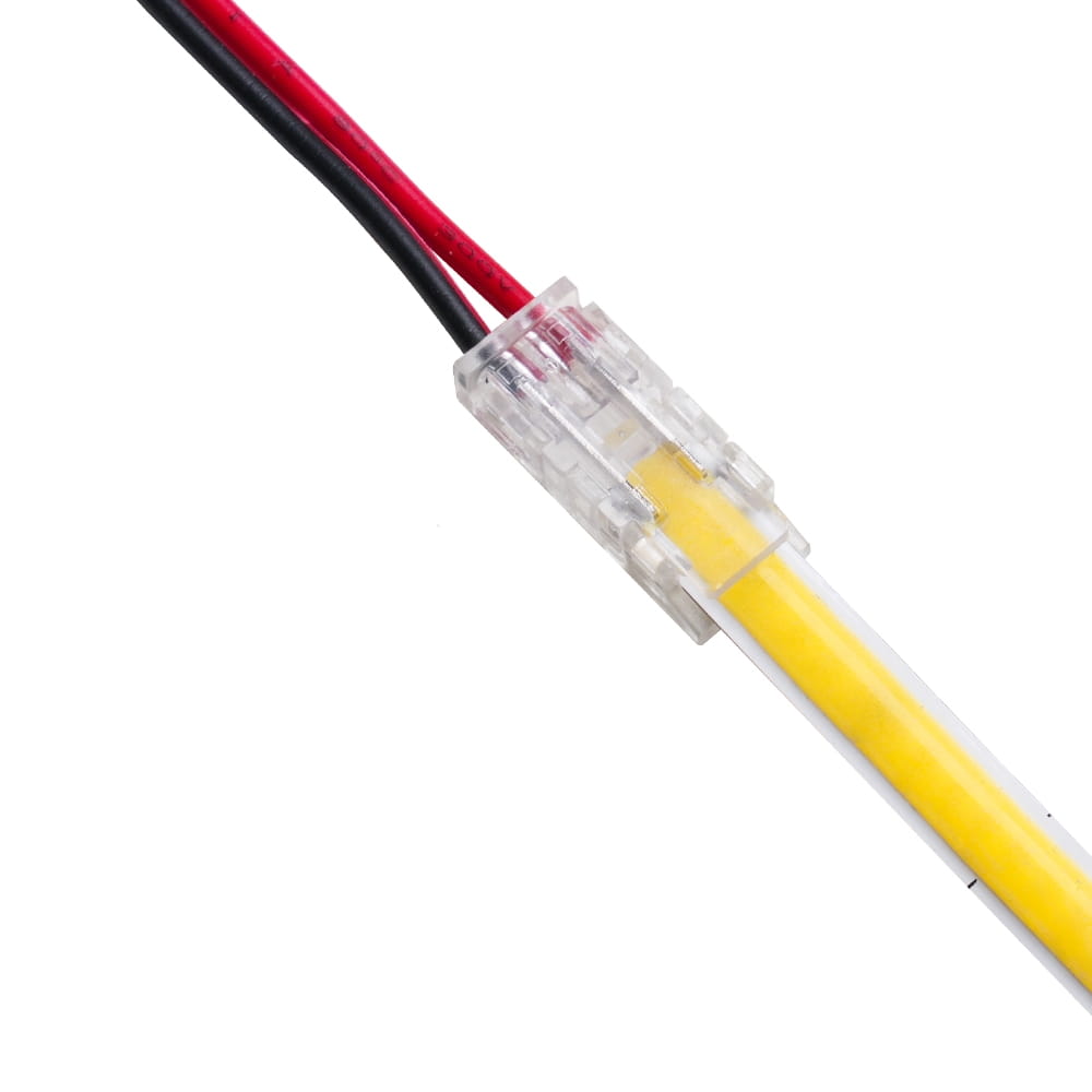 Złączka umożliwia szybkie połączenie jednokolorowej taśmy LED SMD/COB o szerokości 5mm. Zastosowanie złączek ułatwia pracę w ciężej dostępnych miejscach gdzie nie jesteśmy w stanie użyć lutownicy. Umożliwia łączenie bez użycia technologii lutowania.